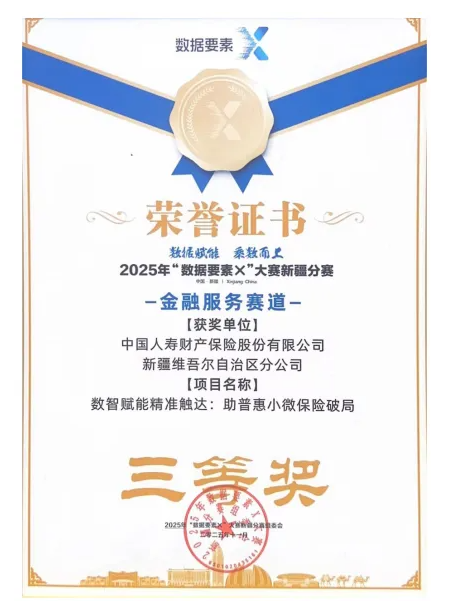 近日,新疆分公司金融科技部与销售业务部联合组建项目组,凭借“数智赋能精准触达—助普惠小微保险破局”数字化解决方案,在2025年“数据要素×”大赛新疆分赛中表现亮眼。经过多轮专业且严格的比拼,最终在金融服务赛道中脱颖而出,成功斩获新疆赛区三等奖。